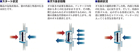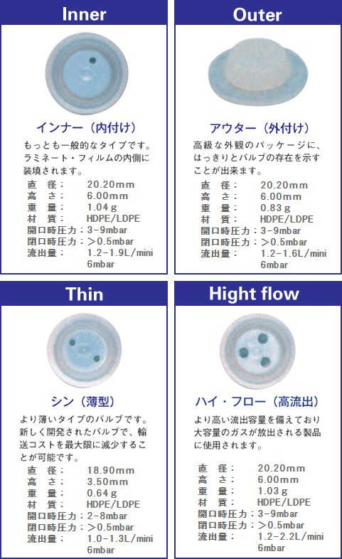 バルブの主な機能は、一般的に包装された製品(例えば焙煎されたコーヒーや味噌などの発酵食品)から発生するガスを放出することが目的です。