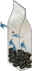 パッケージのラミネートフィルム上に、熱シール可能なポリエチレンのガス抜きバルブがついた包装袋です。