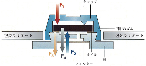 ガス抜きバルブは、パッケージのラミネートフィルム上に熱シール可能なポリエチレンのバルブです。バルブは製品に溶着しますが、食品に適した紙のフィルターが外気から内容物を保護しています。バルブ内部には、バルブを開けたり閉めたりする働きをする、しなやかな円形のゴムがあり、オイルとシリコンの層により、バルブ内部のゴムにより、より確実に密閉します。バルブは、外の周囲の環境圧力(F1)、オイルの毛細管粘着性(F3)及び、ゴムの弾性(F4)の合計より、製品によってもたらされた内圧(F2)の方が高くなった時に、開き、ガスが抜けます。