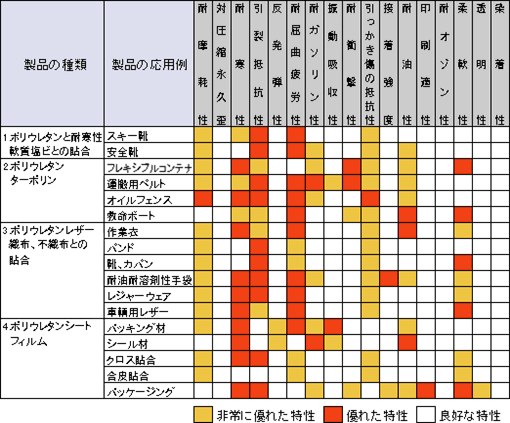 - 織布、不織布、紙、プラスチックフィルムなどと、用途、目的に対応したラミネート加工ができるので、従来、天然ゴム、合成ゴム、軟質塩ビなど、および注型法、カレンダー法、溶液法によるポリウレタン加工で解決できなかったコスト、品質特性の設計ができます。
